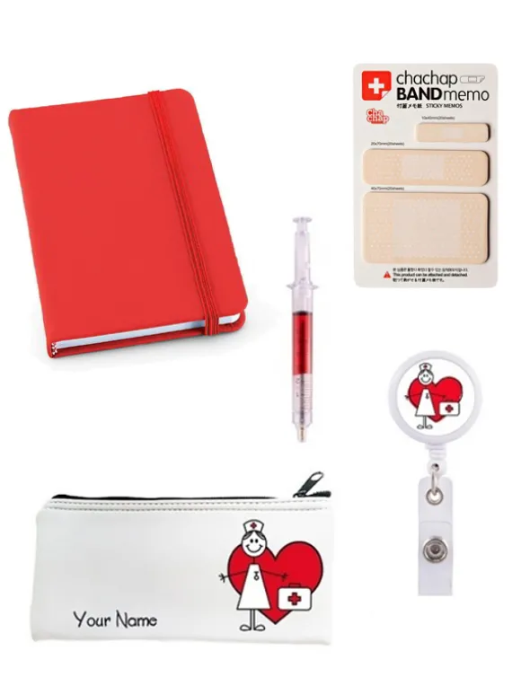 Set met leuke en handige producten voor medisch personeel. Super leuk om cadeau te geven!Deze set bevat populaire en nuttige schrijfwaren die voor zorgprofessionals erg handig zijn. Ook erg leuk om cadeau te geven voor bijvoorbeeld Valentijn of een verjaardag! De set bevat:1 notitieboekje stick nurse1 etui stick nurse1 badge/jojo stick nurse1 spuitpen roodAls je kiest voor naamopdruk worden de etui en het notitieboekje bedrukt met dezelfde naam.