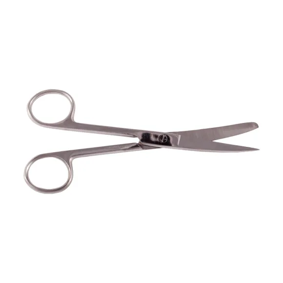 RVS Verpleegkundeschaar.De schaar heeft 1 blad met een ronde, stompe punt en 1 blad met een scherpe punt.Eigenschappen: Lengte: 14 cm. Professionele kwaliteit Roestvrijstaal Gebogen punt